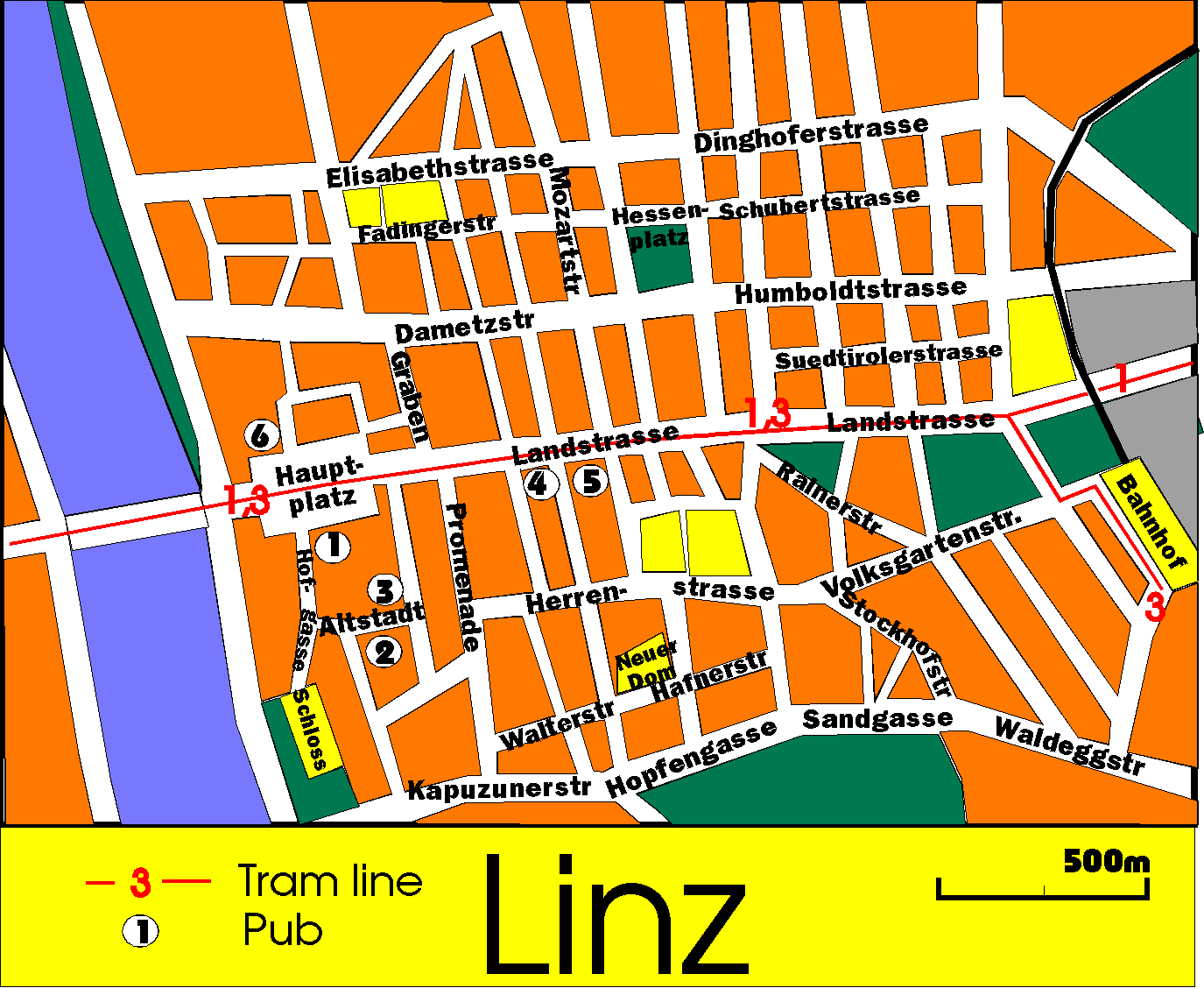 A map of Linz showing the location of the pubs listed above.![]() |